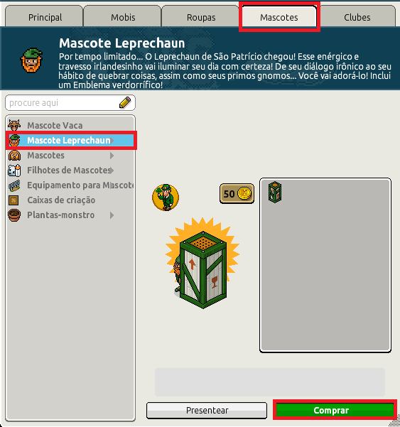 2° Passo: Adquira o mobi "Caixa do Leprechaun" por 50 câmbios.