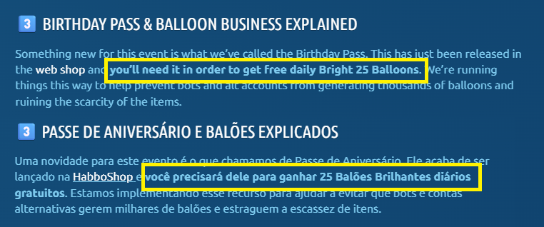 Uma novidade para este evento é o que chamamos de Passe de Aniversário. Ele acaba de ser lançado na HabboShop e você precisará dele para ganhar Balões Brilhantes diários gratuitos.