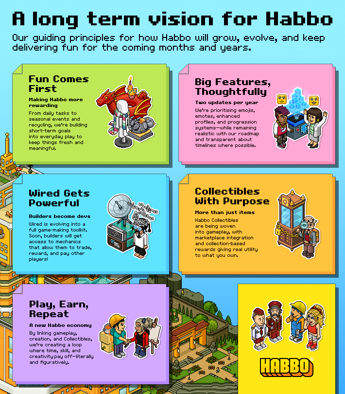 Haverá também uma oportunidade para fazer perguntas sobre o que discutimos abaixo e sobre o Habbo de forma mais geral em um Town Hall que realizaremos mais adiante 👀 Daremos à comunidade vários dias para ler e assimilar este artigo antes de fazermos isso.