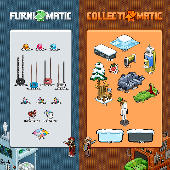Furni-Matic: é o recurso de reciclar itens normais dentro do Habbo, atualmente é cobrada uma taxa de 10 Duckets para reciclar 8 itens.